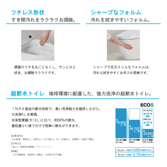 ・ 汚れがつかない『アクアセラミック』が標準装備■□ 超節水 ECO5トイレ □■・洗浄水量大5リットル、小3.8リットル。旧来型便器(大13リットル)と比べ約69%の節水を実現。・2日でおフロ1杯分以上の水が節水できます。また、水道料金は年間約13,800円もお得。・エコロジーでエコノミーな便器です。