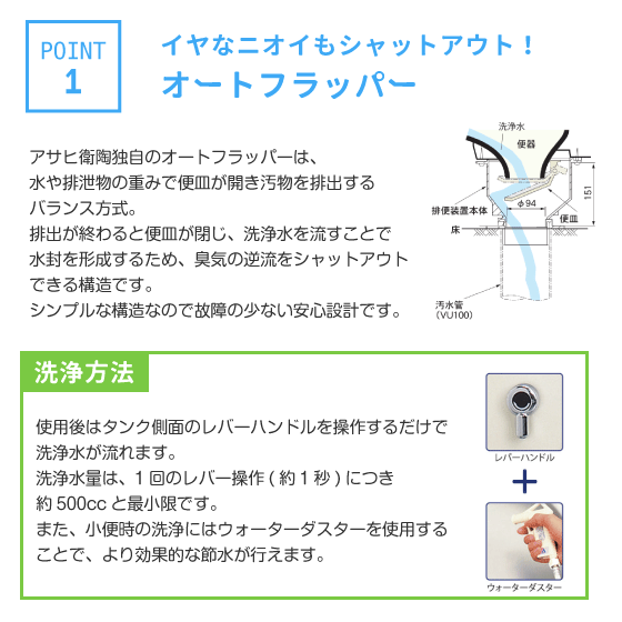 ・ アサヒ衛陶独自のオートフラッパーは、少量の水でもしっかり流せる洗浄方式です。