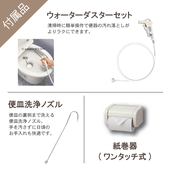 ・ 部分的な汚れや小便時には、付属のウォーターダスターで十分に汚れが落とせ、より効果的な節水が行えます。・ 便器には汚れの付きにくいトイレコートを採用。