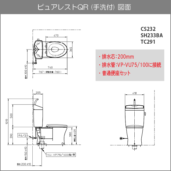 便器 ピュアレストQR(手洗付) 普通便座セット CS232B,SH233BA,TC291 TOTO 床排水 排水芯200mm