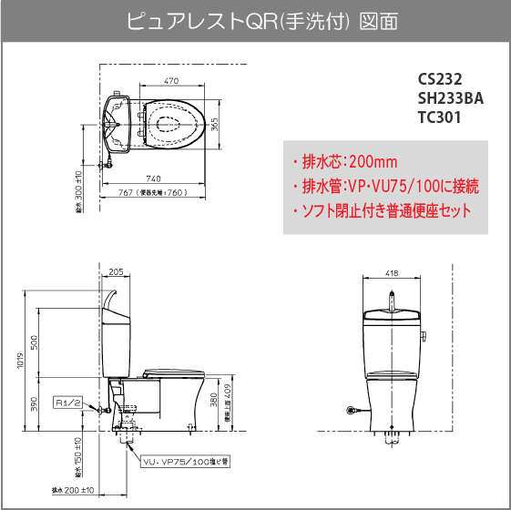 便器 ピュアレストQR(手洗付) ソフト閉止付き普通便座セット CS232B,SH233BA,TC301 TOTO 床排水 排水芯200mm