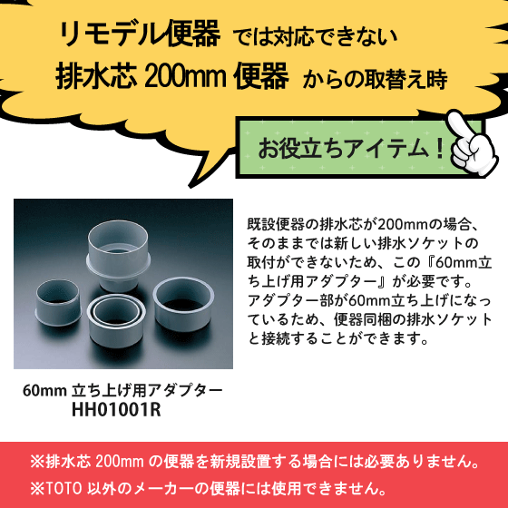 ・ リモデル便器では対応できない、排水芯200mmの便器からの取替えの際、排水管が床面とフラットな場合にご使用ください。