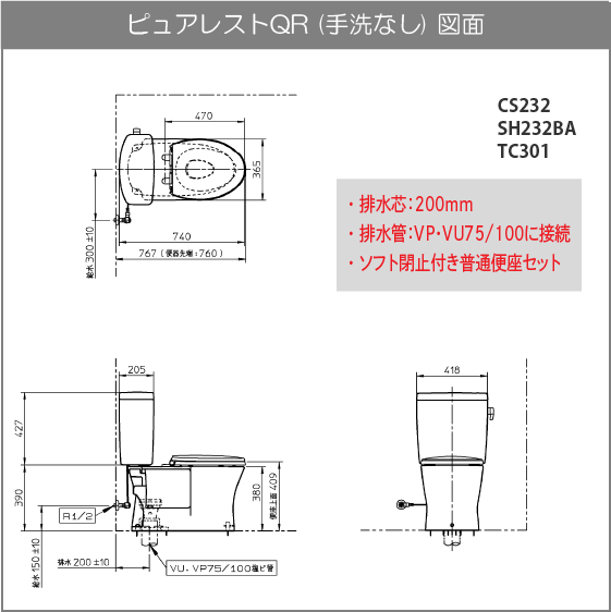 便器 ピュアレストQR(手洗なし) ソフト閉止付き普通便座セット CS232B,SH232BA,TC301 TOTO 床排水 排水芯200mm