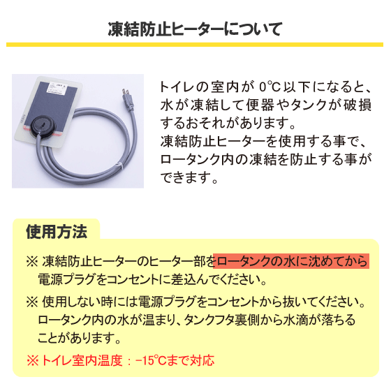 ・ 凍結のおそれがある場合、ロータンク内に入れて使用することで、ロータンク内の凍結を防止することができます。