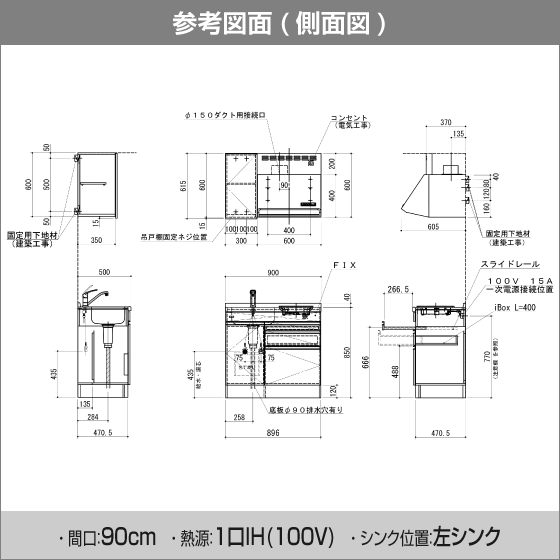 ・ シンク(シングルレバー混合水栓付き)、1口IHヒーター付きの下台とウォールキャビネット、レンジフードがセットになった商品です。