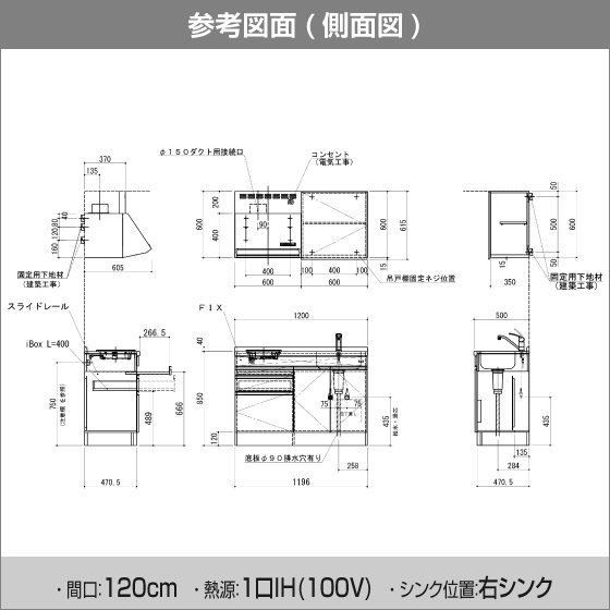 ・ シンク(シングルレバー混合水栓付き)、1口IHヒーター付きの下台とウォールキャビネット、レンジフードがセットになった商品です。