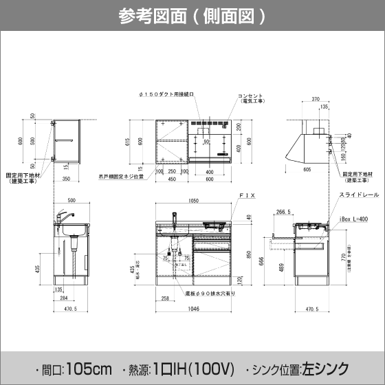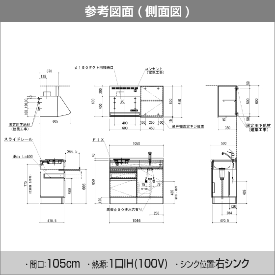 ・ シンク(シングルレバー混合水栓付き)、1口IHヒーター付きの下台とウォールキャビネット、レンジフードがセットになった商品です。