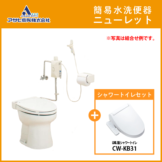 簡易水洗便器 簡易水洗トイレ ニューレット(フラッシュバルブ式) LIXIL製シャワートイレセット AF50BN,CW-KB31A アサヒ衛陶 タンクレス