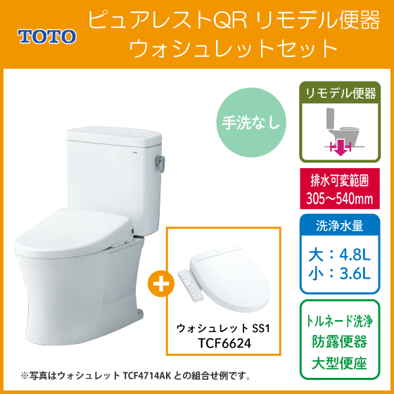 便器 ピュアレストQR リモデルタイプ(手洗なし) ウォシュレットSS1セット CS232BM,SH232BA,TCF6624 TOTO リフォーム用便器 排水アジャスター付き